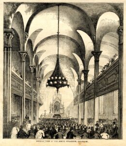 During this time period, newspapers rarely included illustrations in their pages, let alone pictures relating to the Jewish community. One exception was the Illustrated News which printed an image of a synagogue (Congregation Rodeph Sholom) on Clinton Street on the Lower East Side, on May 14, 1853. A curious observation in the accompanying article, “The New Synagogue” states: “The principal portion of their [the Hebrews] service is chanted – one of the essential qualifications of a leader being a thorough knowledge of music, which art is probably more cultivated among the Jews than among any other race in the world.”This magnificent, historic, building still exists today and houses Congregation Chasam Sopher. A fascinating aspect of doing research in the newspapers is the context they provide – other news events of the day, and advertisements such as this one: did any of the women attending the synagogue at the time wear any of these fashions?